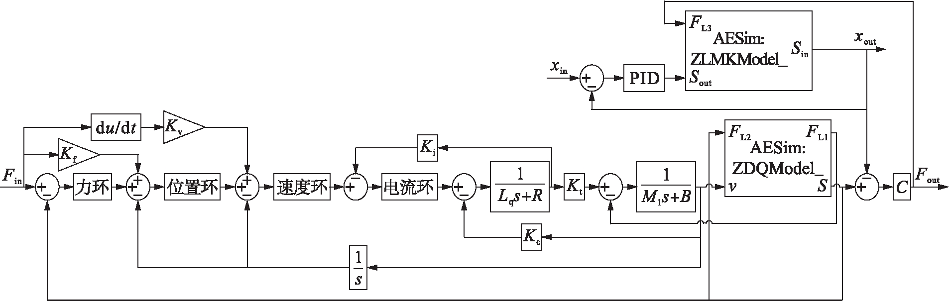在AMESim软件中对已建立的增力模块和伺服作动器液压系统模型分别进行参数设置与编译,然后在Simulink仿真环境中添加S函数,并分别命名为“ZLMKModel_”与“ZDQModel_”,该名称必须与相应的AMESim模型名称一致且必须加下划线,得到的系统联合仿真模型如图5所示.其中:C为力传感器刚度;Fin与Fout分别为输入力和输出力;xin与xout分别为输入位移和输出位移;Ki为电流反馈系数;Kf和Kv分别为力前馈和速度前馈系数,且分别包含一个力指令到位置指令和速度指令的隐式转换.