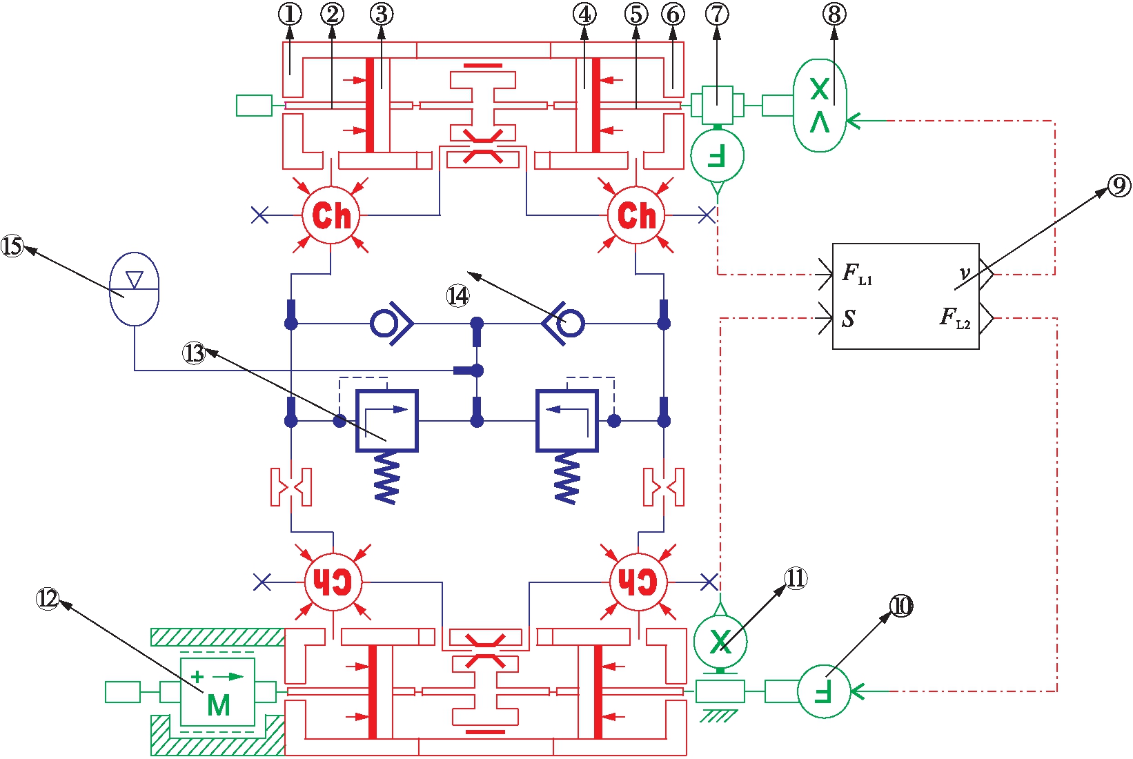 ①、⑥油腔 ②、⑤活塞杆 ③、④活塞 ⑦力传感器 ⑧速度发生器 ⑨接口模块 ⑩力发生器