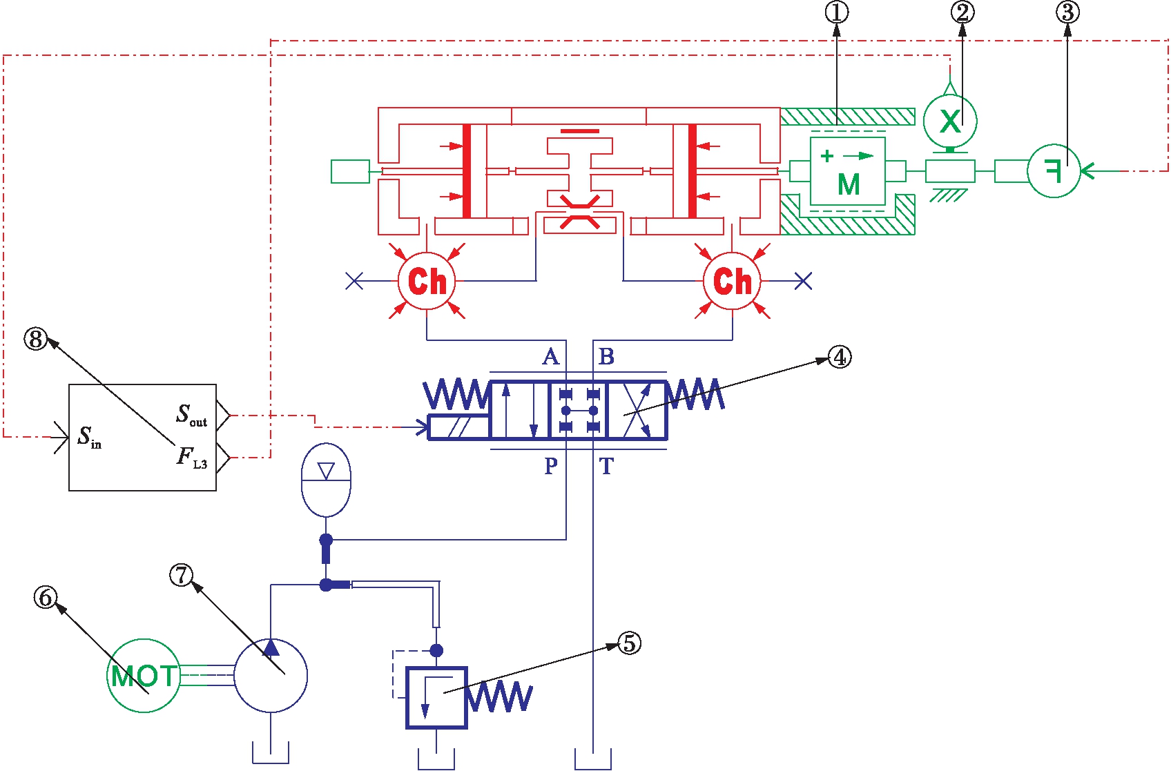 ①质量块 ②位移传感器 ③力发生器 ④电磁阀 ⑤安全阀 ⑥电机 ⑦液压泵 ⑧接口模块