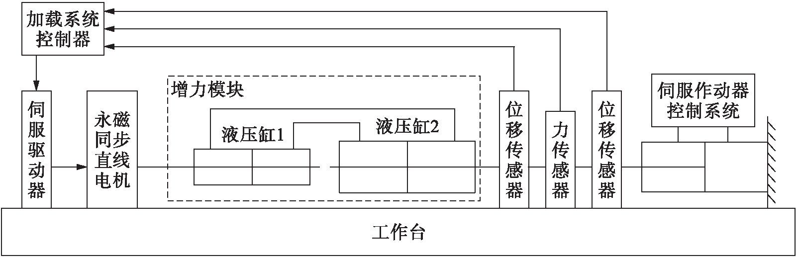 在动态加载过程中由运动控制器产生加载力指令信号,通过直线电机驱动增力模块,从而将力控制信号放大后作用于伺服作动器.增力模块由活塞面积较小的双出杆液压缸1和活塞面积较大的双出杆液压缸2串联组成,选用不同活塞面积的液压缸能够提升系统的驱动力,从而满足不同的加载测试需求.力传感器可以检测伺服作动器实际受到的加载力,并将其反馈至运动控制模块以便实现加载系统的力闭环控制.将两个位移传感器固定于工作台的绝对位置,从而测量加载过程中增力模块与作动器系统输出的位移.