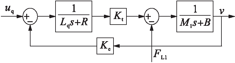 图2中v为直线电机动子线速度;B为粘滞摩擦系数;FL1为直线电机受到的外部负载力;uq为q轴电压;Lq为q轴电感;R为每相绕组电阻;Ke为反电动势常数;Kt为推力常数;M1为直线电机动子部分和液压缸1活塞杆的质量之和.本文选用科尔摩根IC44-200型直线电机,其相关参数为Kt=406,Ke=332,R=6.4 Ω,Lq=63.3 mH.