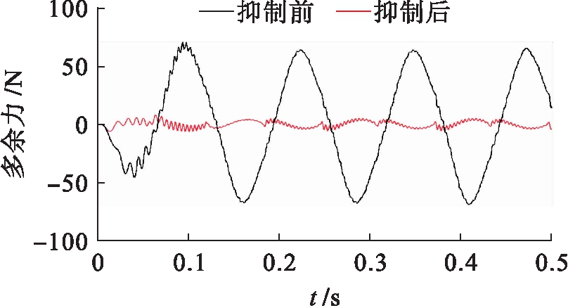 在完成前馈补偿控制器的设计后进行仿真试验.令加载系统输入的力控制信号为零,伺服作动器位移指令信号频率为8 Hz,正弦信号幅值为0.5 mm,基于相应的系统控制方案,得到添加前馈补偿控制器前后的多余力曲线,结果如图7所示.