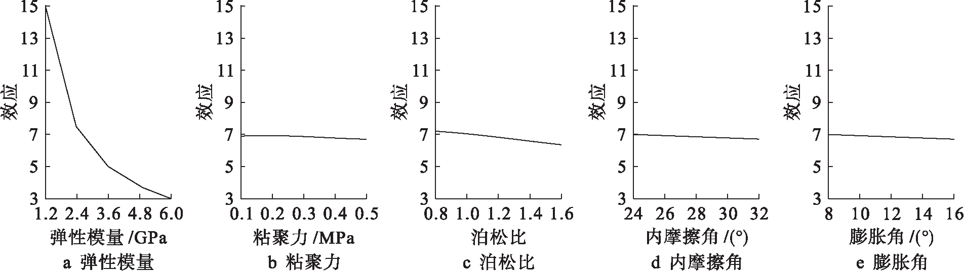 根据表2正交试验,利用极差法进行分析,图10为5个因素的效应曲线图,极差计算结果如表3所示,其中,K1、K2、K3、K4、K5表示各因素下各水平的综合平均值,极差值为相应因素各水平中最大K值与最小K值的差值.通过图10及表3可以得出,弹性模量的极差最大,弹性模量是在隧道开挖过程中对围岩影响最大的因素,且弹性模量为1.2 GPa时,围岩位移达到最大,其次是粘聚力,接着是泊松比,最后是内摩擦角和膨胀角.