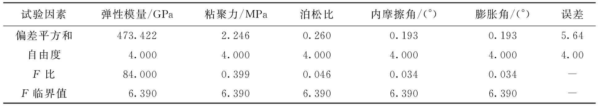 在极差分析中,因为无法区分试验结果之间的差异到底是由于各因素不同引起的还是由于试验误差引起的[10],所以为了更准确地找出影响围岩稳定性的因素,还应该对试验结果进行方差分析.
