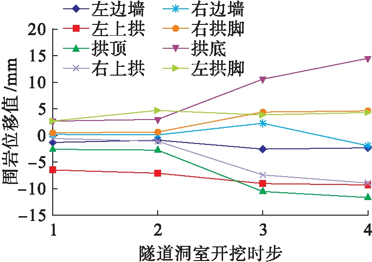 图7为隧道各开挖时步的位移云图,隧道边缘主要控制点在各开挖时步的位移值如图8所示.由图7、8可以看出,隧道拱顶区域发生下沉,最大沉降值出现在拱顶处为11.59 mm,而在拱底区域则发生隆起,最大隆起值为14.47 mm.随着隧道土体的开挖,围岩的位移呈现逐渐增大的趋势,隧道开挖后,围岩的沉降值主要出现在开挖第三部分土体的过程中,这是因为当隧道拱顶中央悬空之后,容易产生围岩的松动土体掉落,左侧开挖后,初衬支护快速封闭,从而限制左半部分围岩的沉降,而右侧未开挖的围岩由于支护和约束不够,导致围岩的沉降值较大.对于隧道底部的隆起情况,为了限制拱底隆起过大,应该及时施加衬砌仰拱,以防止地基失稳而导致隧道下沉,从而保证隧道结构的稳定性.
