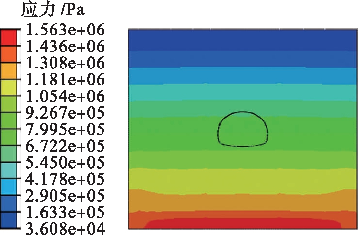 将土体的自重作为土体压力,假定在隧道施工之前,初始地应力仅在岩体的自重下产生,即岩体的初始地应力场就是自重应力场.根据实际情况,可以通过添加场变量的方式模拟围岩弹性模量的减小,利用弹性模量的衰减来模拟围岩应力的释放现象,在施加支护前,通过添加场变量,使岩体的弹性模量释放到40%.初始应力平衡的结果如图2所示.从图2中能够得到应力量级与自重应力量级一致,达到地应力平衡要求.