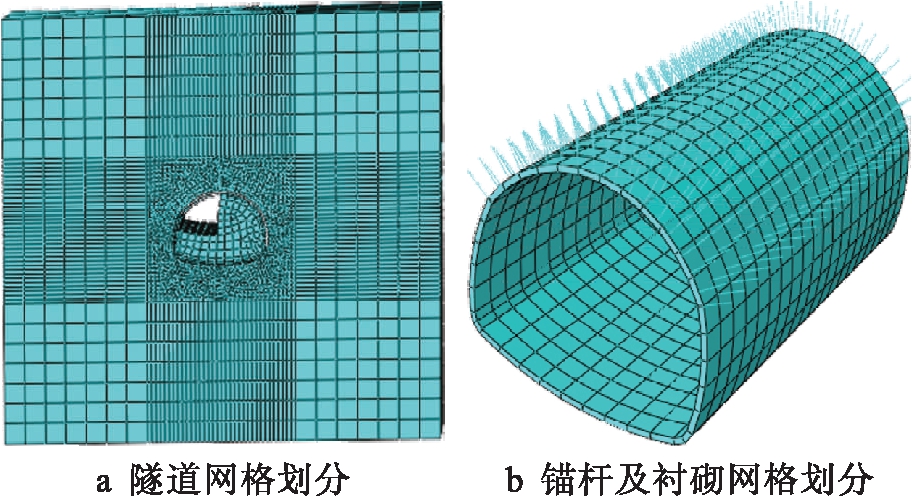 库仑)模型,其单元类型为三维八节点线性减缩积分实体单元(C3D8R),网格划分技术为扫掠(sweep),支护结构中的衬砌和锚杆的本构关系定义为弹性模型,锚杆的单元类型采用两节点线性三维桁架单元(T3D2),网格控制算法选取中性轴算法,建立的有限元模型网格划分如图1所示.