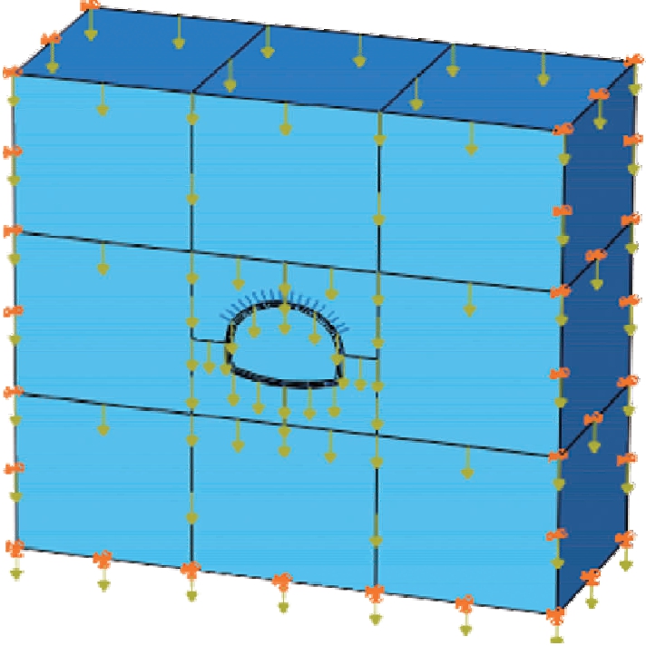 对模型左、右及前、后均施加水平位移约束,对模型底部施加x、y、z三个方向的约束,地表不施加位移约束采用自由边.模型的边界条件及荷载的加载情况如图3所示.