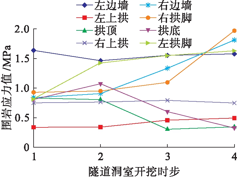 图5为隧道各开挖时步的主应力云图,隧道边缘主要控制点在各开挖时步的应力值如图6所示.由图5、6可以看出,在隧道轮廓的拱脚处出现应力集中现象,隧道轮廓周边围岩的主应力较大,最大主应力出现在右拱脚处为1.9 MPa,最小主应力出现在拱底处为0.24 MPa.在隧道土体开挖时,应该在隧道的拱脚处增加衬砌和支护结构材料的强度和厚度,以防止衬砌的挤压破坏.随着隧道土体的开挖,围岩的应力值呈现逐渐降低的趋势,这是因为在隧道开挖后,通过衬砌和锚杆的支护,封闭成环状,使围岩发挥整体的成拱效应,从而减小应力释放.