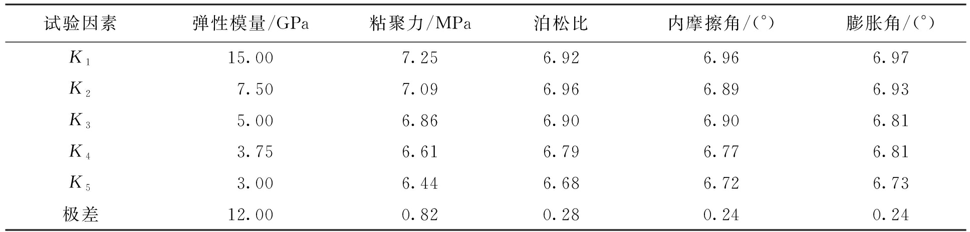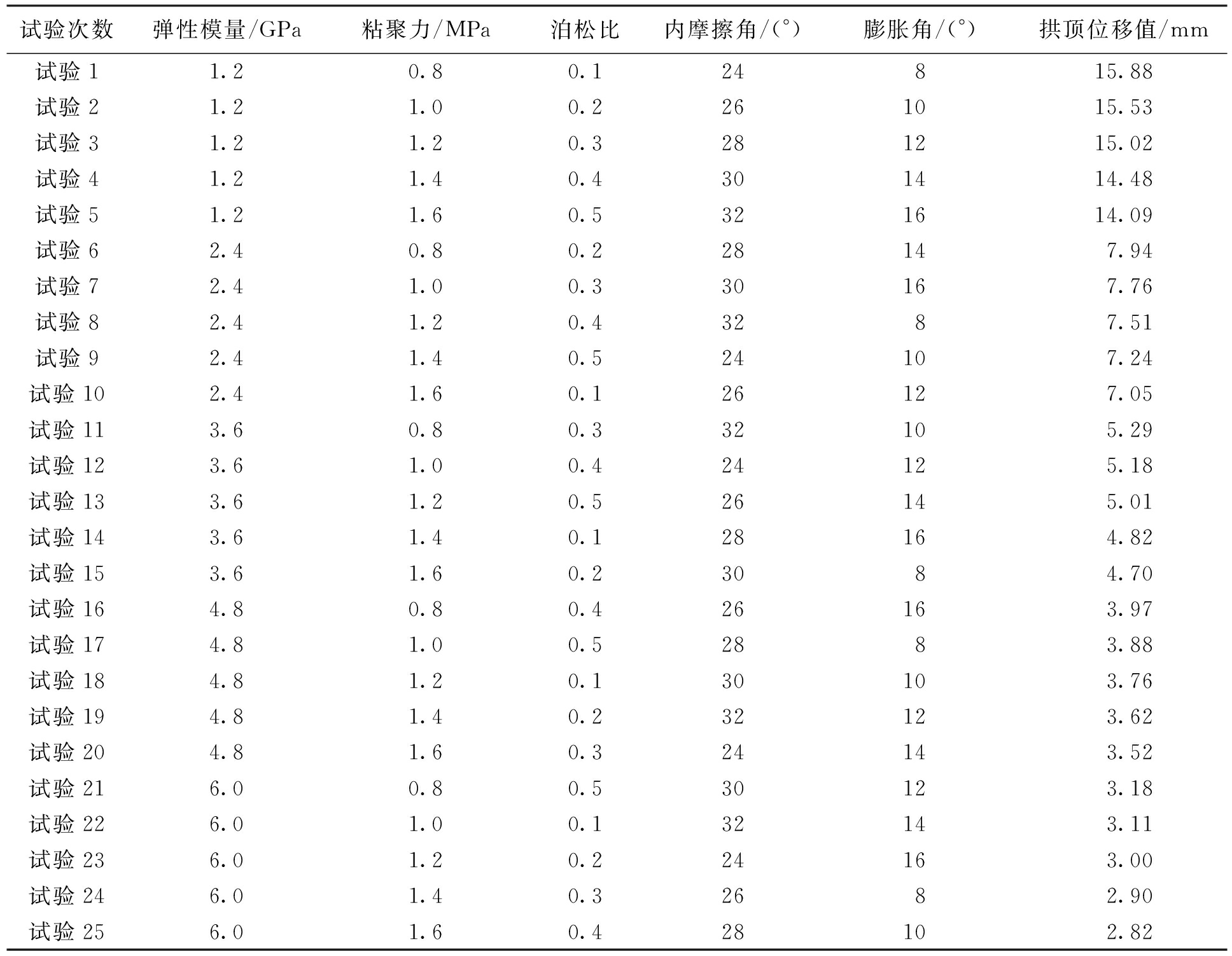 共有5个试验参数,取每个试验因素为5水平,根据正交表L25(55),具体试验参数如表2所示.将每个试验方案所对应的力学参数进行有限元数值模拟计算,按照正交表做25次数值模拟运算,得到隧道边缘拱顶的位移值,计算结果如表2所示.