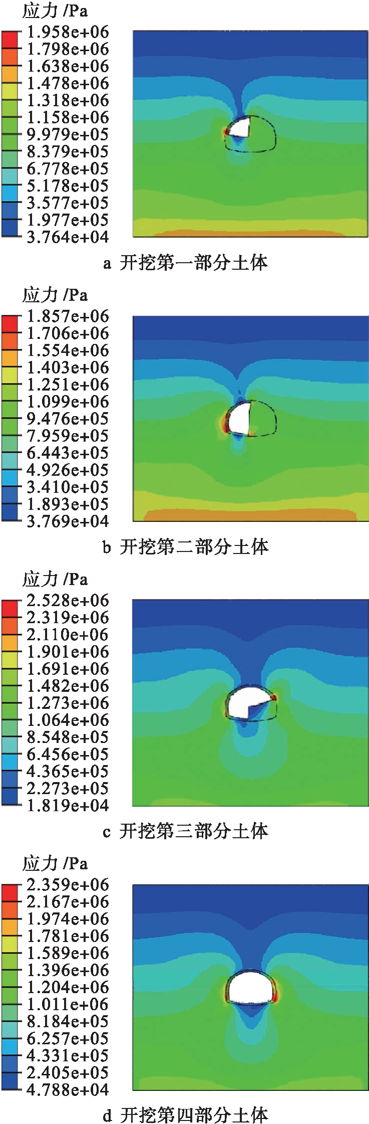 图5 各开挖时步的应力云图