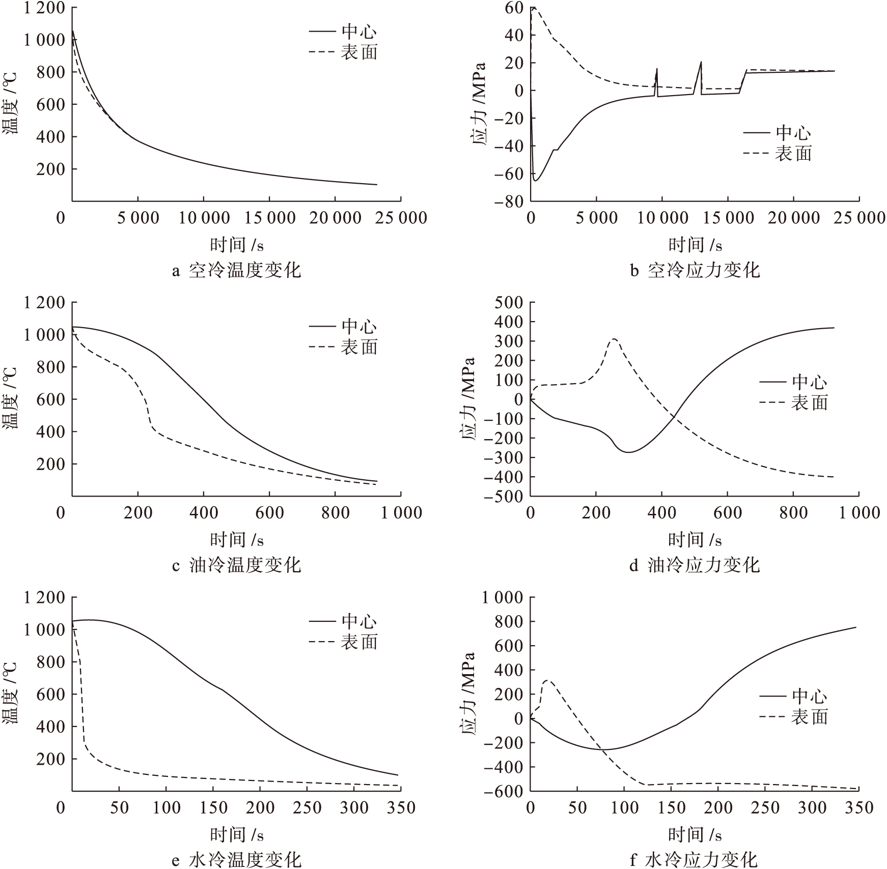 图7淬火温度为1050℃时不同冷却方式下温度和应力随时间的变化曲线