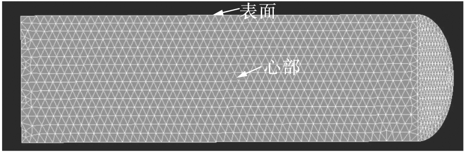为了分析在不同冷却方式下铸锭不同位置应力和温度的变化规律,根据实际铸锭尺寸建立了铸锭三维模型并进行了网格划分,结果如图2所示.网格划分中四面体的最大尺寸为20 mm.进行解析所需的傅里叶方程可以表示为