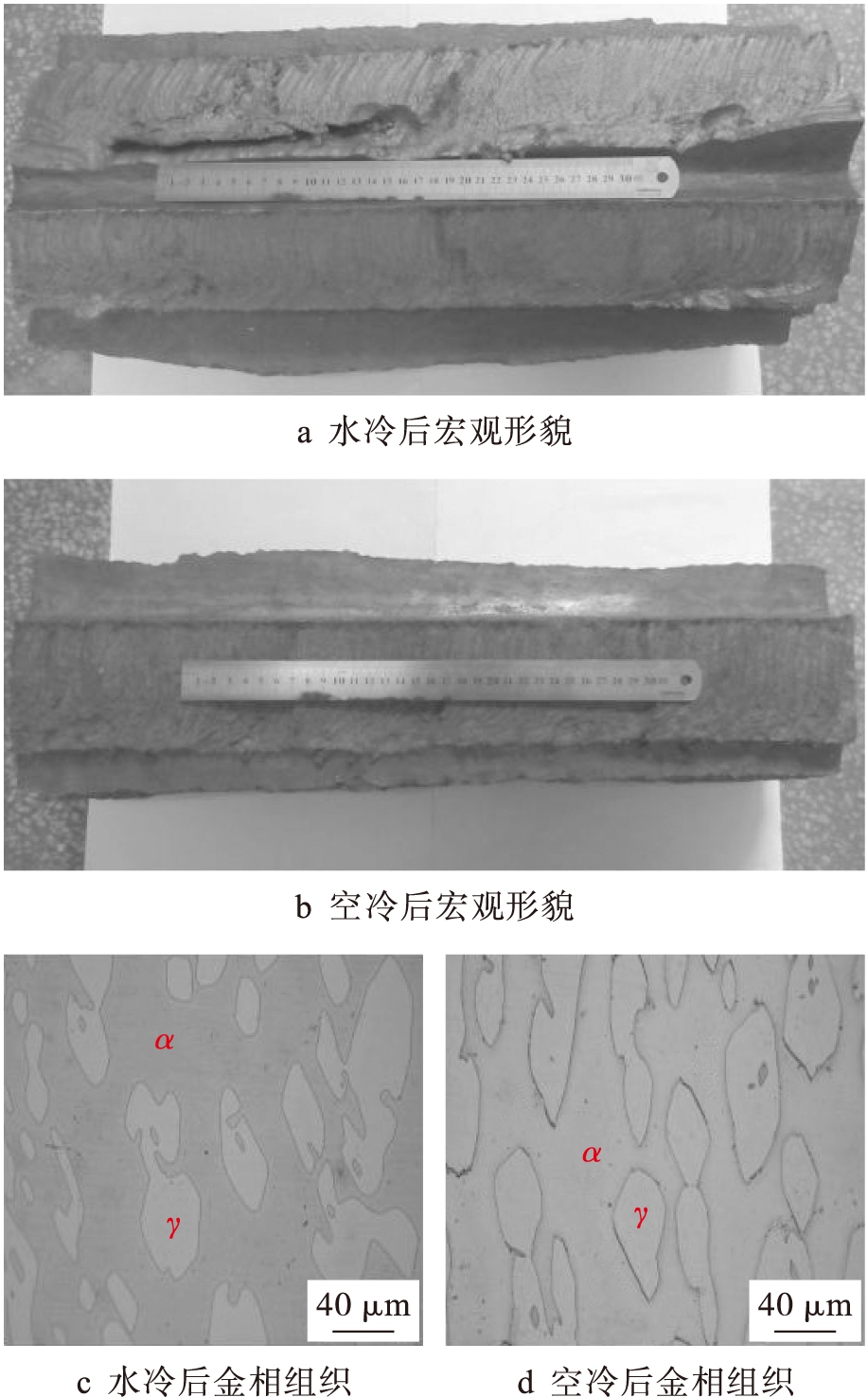 大尺寸00Cr25Ni5Mo3N双相不锈钢铸锭在热处理过程中存在一个比较棘手的难题.该铸锭经过固溶处理(1 120 ℃×4 h)后,采用水冷冷却方式会导致铸锭开裂(见图1a),但铸锭未开裂位置的性能满足性能指标.而采用空冷冷却方式虽然不会导致铸锭开裂(见图1b),但铸锭性能不能满足性能指标,且铸锭韧性较差.观察图1c、d中的金相组织可知,水冷后铸锭的奥氏体和铁素体界面处未发现第三相,而空冷后铸锭的奥氏体和铁素体界面处出现了明显的第三相.