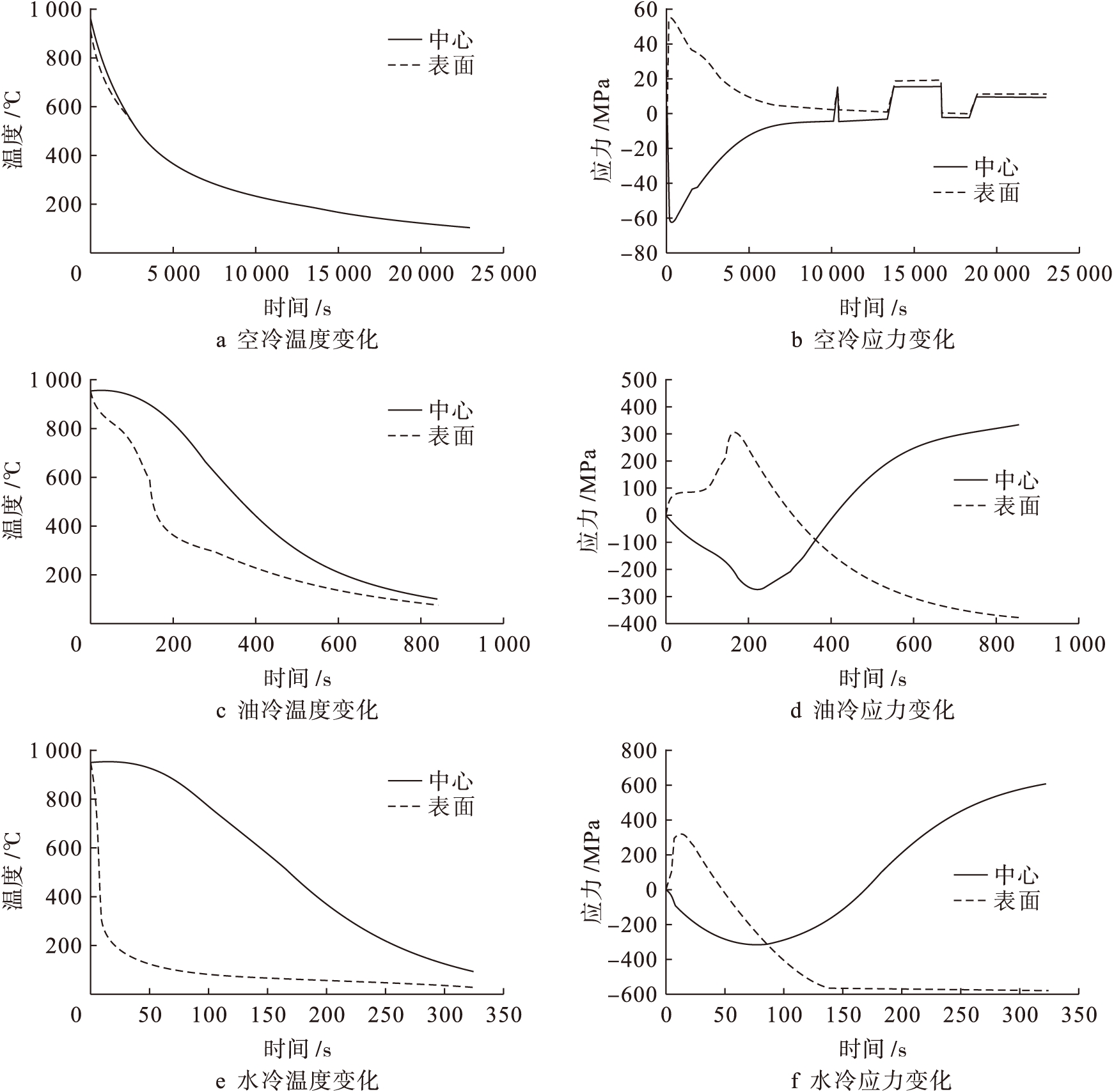 图8淬火温度为950℃时不同冷却方式下温度和应力随时间的变化曲线
