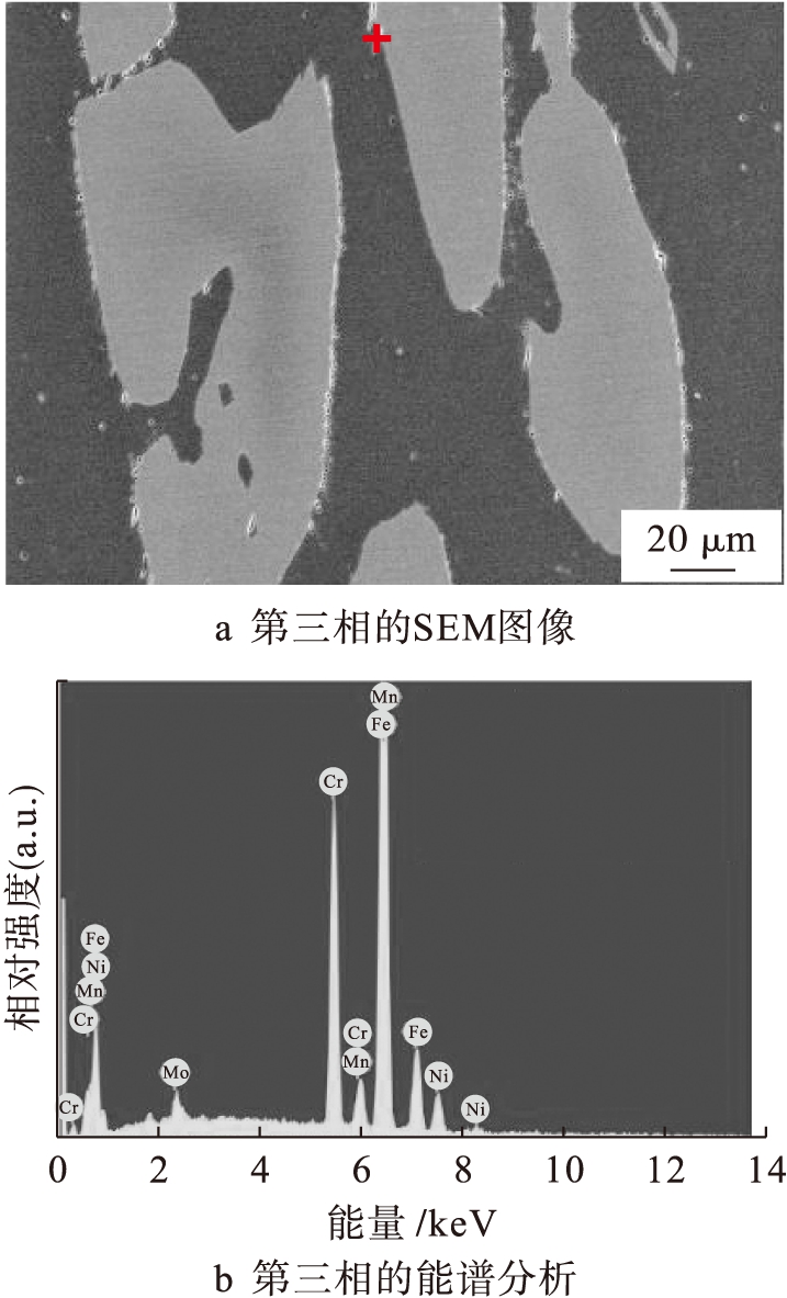利用能谱分析方法对奥氏体与铁素体界面处的第三相进行了成分分析.由图4b可知,第三相中w(Fe)=58.83%,w(Cr)=27.21%,w(Ni)=3.98%,w(Mo)=9.52%,w(Mn)=0.46%.可见,第三相中的Cr和Mo含量明显高于其在基体中的含量,且该成分与相关研究[13]中σ相的成分一致,因此,可以认为图3d中的第三相为σ相.通常认为,σ相的析出速率是由热力学驱动力所控制的,且Cr和Mo在铁素体中的扩散能力高于其在奥氏体中的扩散能力[14],这也是界面处的σ相会向铁素体内部生长的原因.由图4a可见,σ相附近出现了明显的点蚀,这是由于σ相中含量较高的Cr和Mo元素的富集导致其周围存在贫Cr区,从而造成试样耐蚀性能降低[15-17].