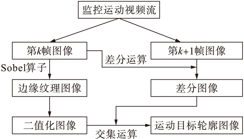 采用基于Sobel算子的运动视频目标轮廓粗检测算法对运动视频目标轮廓进行粗检测,算法模型如图1所示.从运动视频中采集连续的第k帧以及第k+1帧运动图像,对第k帧进行备份,采用Sobel算子划分第k帧备份图像的纹理,获取同时存在背景目标和运动视频目标的轮廓图像A.对第k帧和第k+1帧图像做差分运算,获取差分图像[3].差分图像内目标像素位置和对应轮廓图像A内轮廓像素点位置的交集则为运动视频目标,对图像A进行二值化操作后,再和差分图像进行交集运算,能够获取运动视频目标的粗轮廓.