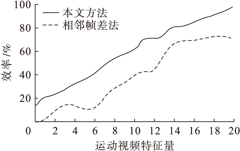 对比分析采用本文方法和相邻帧差法进行运动视频目标轮廓检测的运行效率,结果如图9所示.由图9可知,在运动视频特征量变化的情况下,采用传统相邻帧差法时,其检测率一直处于不稳定的状态,最高时达到了78.8%,但多处出现波动,忽高忽低,稳定性较差;采用改进方法时,随着视频特征量的变化,检测效率逐渐增加,且最高达到了99.1%,相比传统相邻帧差法提高了20.3%,且只有3处出现波动,稳定性相比传统相邻帧差法要好得多,说明本文方法极大地提高了运动视频完整轮廓检测的效率,具有一定的实用性及优越性.