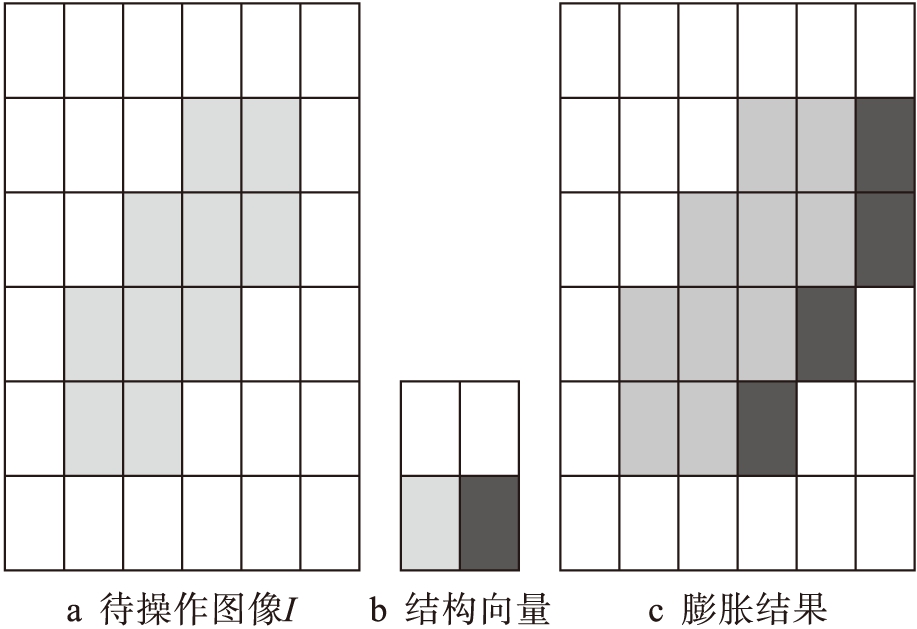 图2a用于描述需要进行腐蚀化操作的图像I,其中,各单元格用于描述一个像素点,灰色范围用于描述前景点.图2b为结构向量,灰色和黑色范围是可用结构向量,黑色范围对应的位置是结构向量原点[13].对图2a进行腐蚀处理,重复检索图像I内各点(不包括边缘点),若检索到含有与结构向量一致的子图像,则将图像I内与结构向量相关的像素点标识成腐蚀结果点,获取的图像腐蚀结果如图2c所示,其中,黑色范围是腐蚀结果,灰色范围被腐蚀掉[14].对比分析图2a、c可知,图2a边缘区域被过滤掉,并且向内缩减.腐蚀处理能够过滤掉图像内的毛孔,清除图像中的噪声.