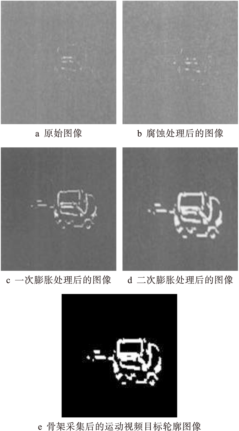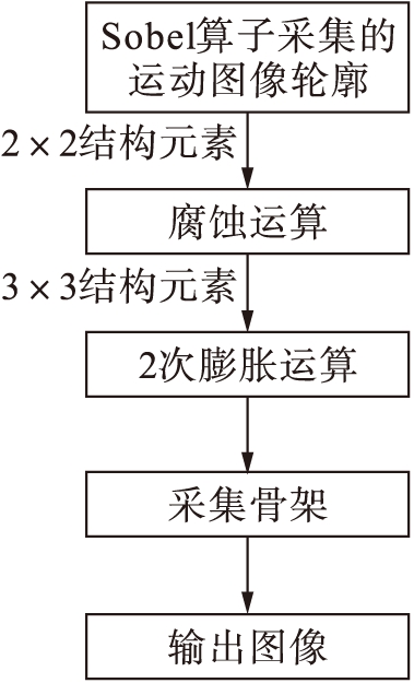 采用Sobel算子采集运动视频轮廓图像时,只采用简单的差分运算对帧图像进行差分分析,使得获取的运动轮廓图像存在较高的噪声.受到局部背景边缘的干扰,差分运算获取的图像边缘较为粗糙,存在较多的毛刺以及独立点.局部背景边缘干扰使得采集出的运动视频目标图像轮廓拓扑形状宽窄不定,呈现断裂的分布状态.因此,为了解决局部背景边缘的干扰,采用基于形态学后处理的运动视频目标轮廓检测算法,获取更为完整的运动视频轮廓.先通过腐蚀算法去除图像中的噪声,再通过膨胀运算扩张图像边缘,对图像中的毛孔以及连接范围间的孔洞进行修补,通过高速并行细化算法采集图像的骨架,算法模型如图4所示.