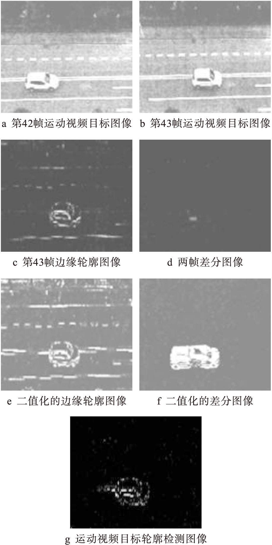 实验采用本文方法检测运动视频目标粗轮廓图像,采用Sobel算子对图5a、b进行操作后,获取的运动视频目标粗轮廓图像如图5c所示.而采用帧差分法对图5b进行处理后,获取的结果如图5d所示.采用图5d可实现运动视频目标的初步识别,因此,对边缘轮廓图像以及差分图像进行二值化处理,结果如图5e、f所示,最终的检测结果如图5g所示.