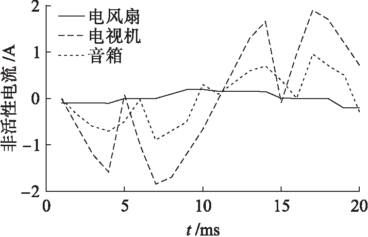 本文设置式(6)中T为120 s,并根据采集到的电流、电压和功率值分别计算得到如图2所示的电风扇、电视机和音箱3种低功率电器的非活性电流.