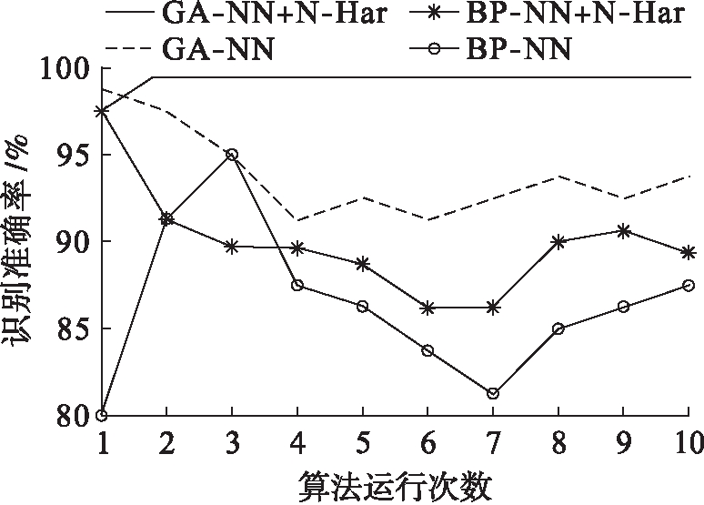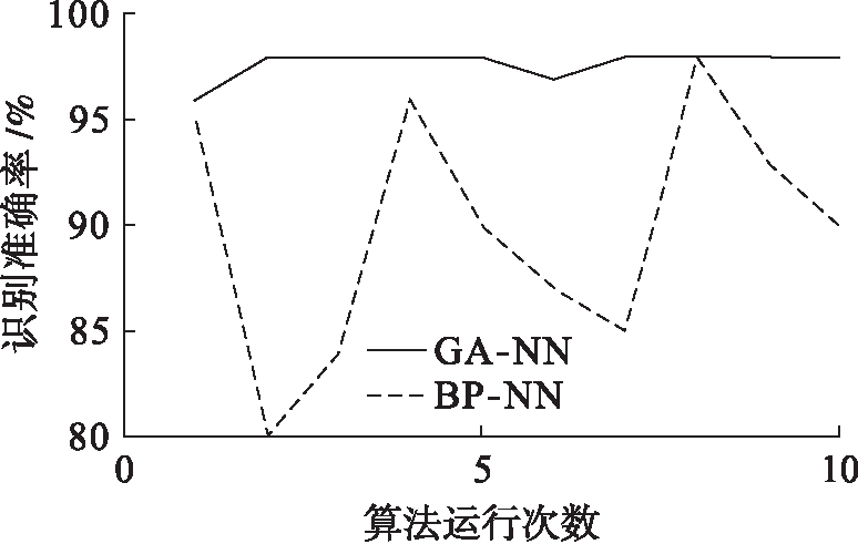本文将提出的遗传算法优化的神经网络(GA-NN)与BP神经网络(BP-NN)的识别准确率进行了比较,结果如图6所示.由图6可以看出,两种算法的识别准确率均不稳定,GA-NN的最大准确率达到了98%,比传统BP-NN的准确率有所提高.