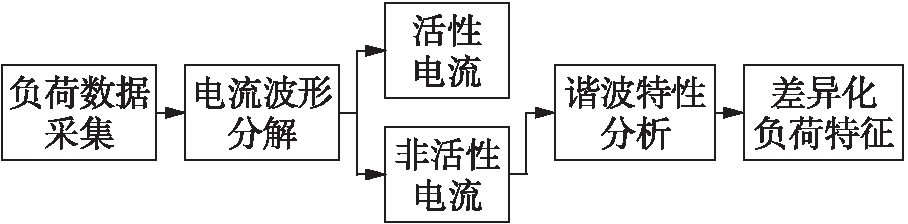 非侵入式负荷检测系统中常用的特征可以分为稳态特征和暂态特征两种.其中,一般采用谐波分析和时域分析法提取用户的有功功率、无功功率和电压、电流等稳态特征;采用小波分析和频谱分析提取暂态特征.然而,当用电器的功率、电压和电流等稳态特征具有较高的相似度时,并不能有效地区分不同的用电器,识别效果较差.针对这一问题,本文使用了一种谐波特征提取方法将用户的电流波形分为非活性和活性两部分,以体现不同用电器间的差异性,从而提高识别精度.谐波特征提取流程如图1所示.