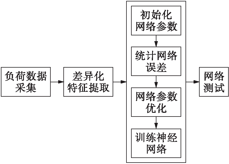 本部分使用上文提取的非活性电流特征及其他暂态和稳态特征,提出了一种基于遗传算法的负荷识别方法,负荷识别基本流程如图5所示.该算法使用遗传算法优化神经网络权重、阈值和隐含层神经元个数,实现提高负荷识别精度的目的.其中,神经网络的输入为负荷数据的各种特征组合;输出为测试场景的用电器种类,每个输出神经元编码一种电器的开关状态.本文使用网络误差的2范数作为遗传算法的适应度函数及遗传算法的优化目标,求得使误差最小的网络参数.