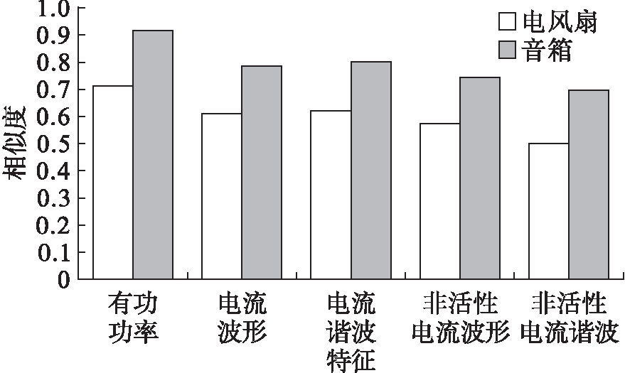 式中:P为总采样次数;ye|(a,c)为电器a的特征c的第e个采样值.两电器的相似程度越大,得到的值越大,表明所使用的特征c并不适合负荷的识别.图4分别比较了音箱和电风扇的电流波形、有功功率、电流谐波特征、非活性电流波形和非活性电流谐波的相似度.从图4中可以看出,电风扇与音箱在各种特征中具有较高的相似度.相比于其他3种特征,非活性电流波形及其谐波相似度最低,由此表明,采用非活性电流特征能体现出不同电器间的差异性.
