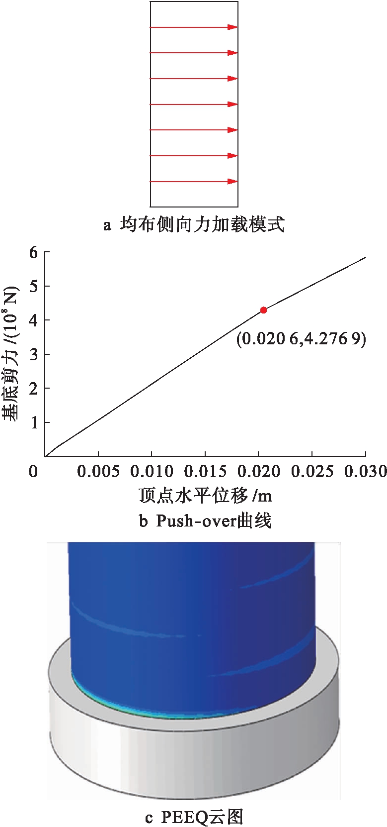 为了得到核安全壳结构发生开裂时的顶点水平位移损伤指标,采用均布侧向力加载模式,对核安全壳结构进行静力弹塑性分析,分析结果如图5所示.由图5b可知,核安全壳结构发生开裂时的顶点水平位移为20.6 mm,响应的基底剪力为4.276 9×105 kN.由图5c核安全壳结构发生开裂时的PEEQ云图可知,均布侧向力加载模式下结构底部率先发生开裂.