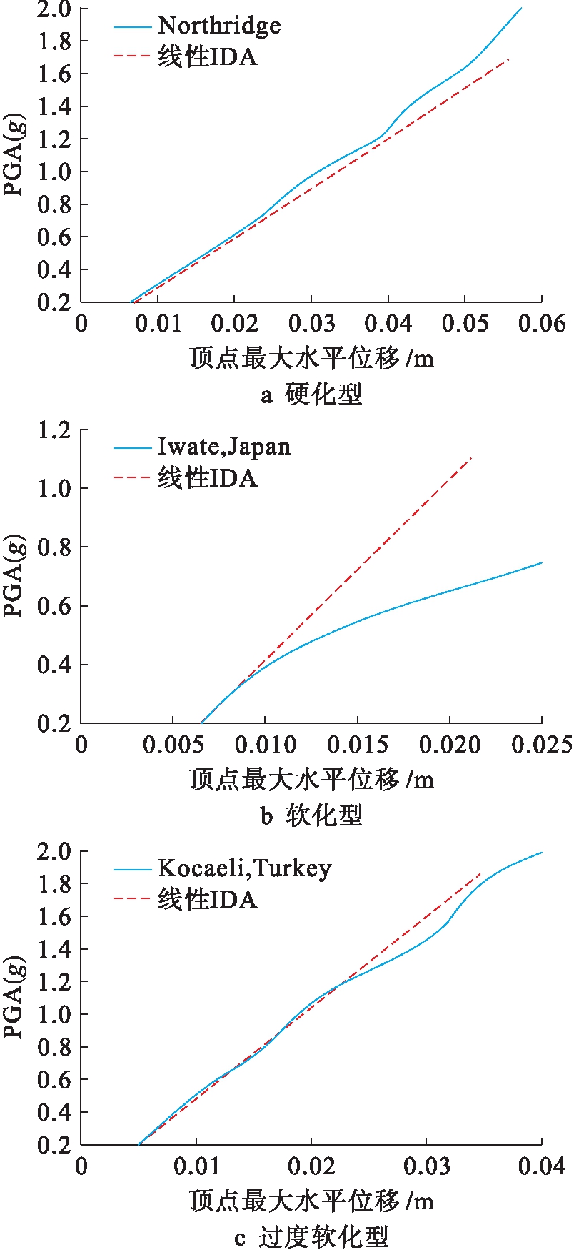 为了说明IDA曲线的差异性,引入线性IDA曲线的概念,线性IDA曲线的斜率与结构处于线弹性阶段IDA曲线斜率相等[8].图4a为硬化型IDA曲线,图中结构IDA曲线位于线性IDA曲线的上方,IDA曲线表现出“震荡”现象,即随地震动强度增大结构损伤降低.对于实际结构而言,意味着结构的损伤积累发生在结构的不同部位,最终导致结构塑性耗能大大提高,抵抗地震的能力大大提高[9].图4b为软化型IDA曲线,图中结构IDA曲线位于线性IDA曲线的下方,该模式下结构IDA曲线比较平滑.图4c为过度软化型,图中结构IDA曲线表现出一定的“硬化”特征,随着结构顶点水平位移的增加,IDA曲线出现“软化”现象.