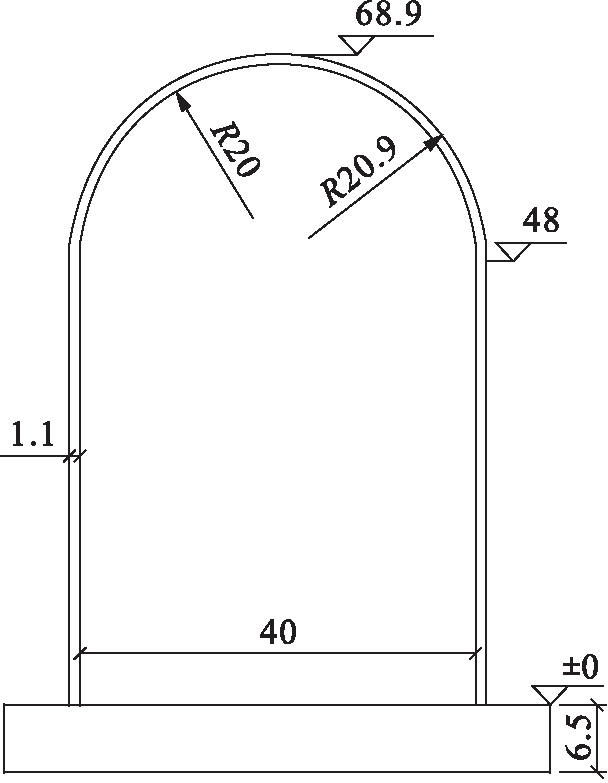 某预应力混凝土核安全壳结构由半球形穹顶、圆柱形筒体和基础底板三部分组成.半球形穹顶内径40 m、穹顶壁厚0.9 m;圆柱形筒体内径40 m、筒体高48 m、筒壁厚1.1 m;基础底板厚6.5 m;结构总高度68.9 m;混凝土强度等级为C50[7].核安全壳结构几何尺寸如图1所示(单位:m).