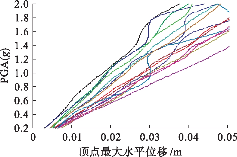 2) 采用增量动力分析法得到以核安全壳结构顶点水平位移为横坐标,以PGA为纵坐标的IDA曲线簇.IDA曲线簇表明,IDA曲线形状受到地震动记录的影响,不同地震动记录作用下核安全壳结构的IDA曲线表现出一定的离散性.随着地震强度的增加,IDA曲线簇的离散性逐渐体现并越发明显.