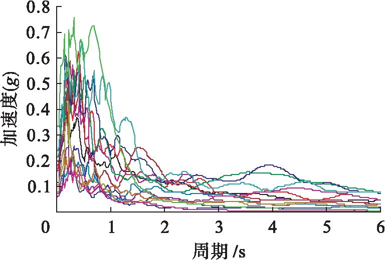 核电厂场址抗震设防烈度为7度;场地类别为Ⅱ类;设计地震分组为第三组;设计基准地震强度PGA为0.20g.据此从美国太平洋地震研究中心(PEER)强震记录数据库中选择15条具有一定代表性的实际地震动记录.地震动信息如表1所示,所选地震动的反应谱如图3所示.