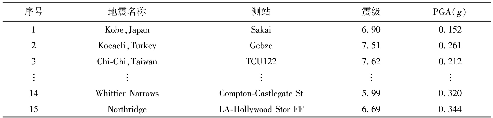 序号地震名称测站震级PGA(g)1Kobe,JapanSakai6.900.1522Kocaeli,TurkeyGebze7.510.2613Chi-Chi,TaiwanTCU1227.620.212︙︙︙︙︙14Whittier NarrowsCompton-Castlegate St5.990.32015NorthridgeLA-Hollywood Stor FF6.690.344
