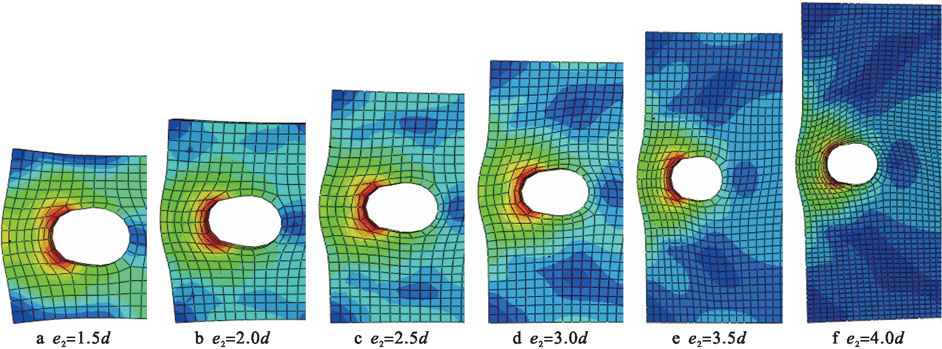 图6 当e1=1.5d时不同e2/d下的板件达到承压荷载时的破坏形态