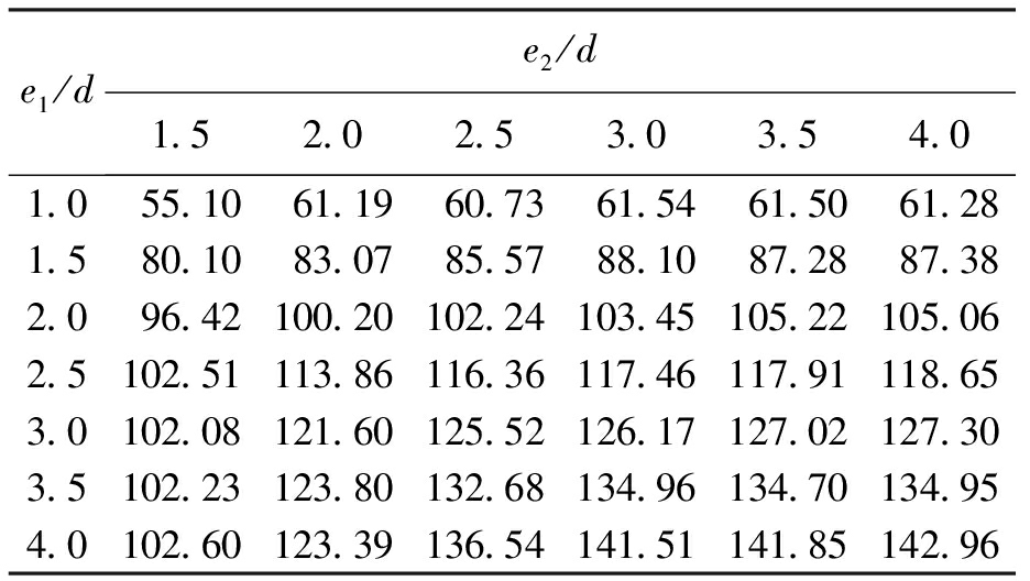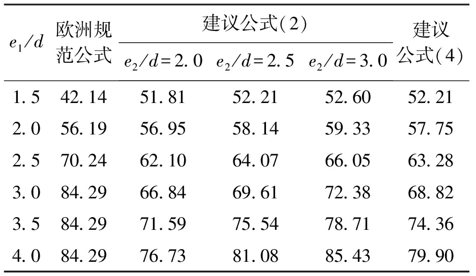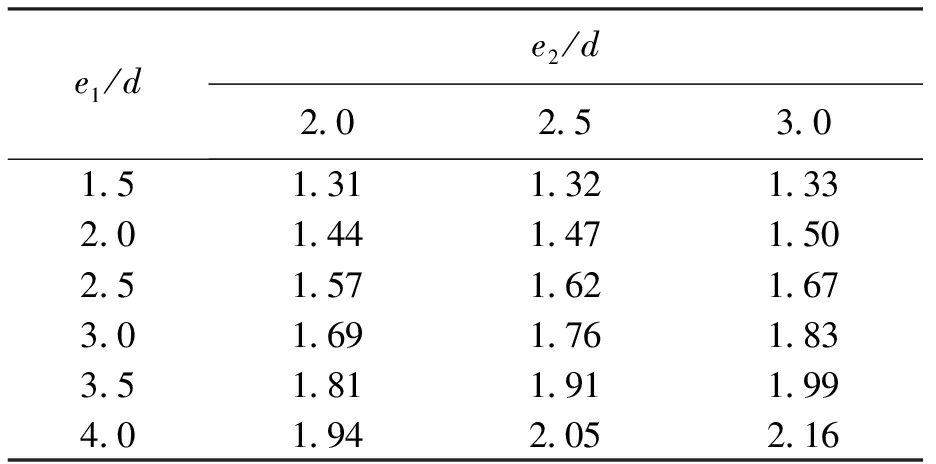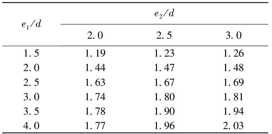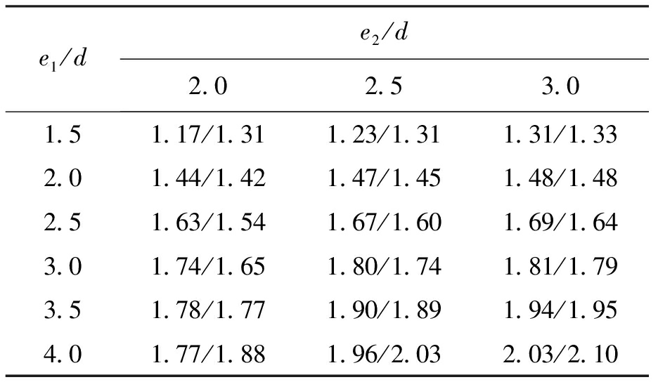 式(4)的适用范围为2d≤e2≤3d,1.5d≤e1≤4d,当e2≥3d时取e2=3d,当e1≥4d时取e1=4d.将式(4)的模拟结果与有限元计算结果进行对比,结果如表6所示.从表6中可以看出,式(4)能较好地模拟有限元计算结果,表6中数据前为建议公式值,后为有限元计算值.
