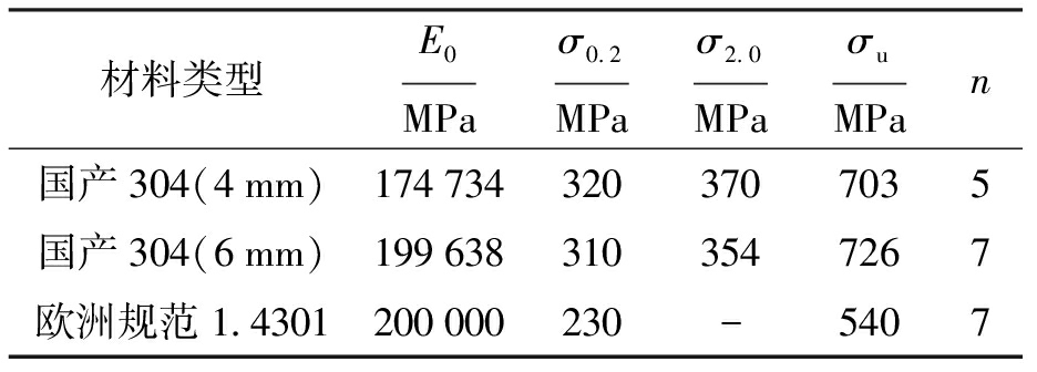 表1 不锈钢材料的材性数据