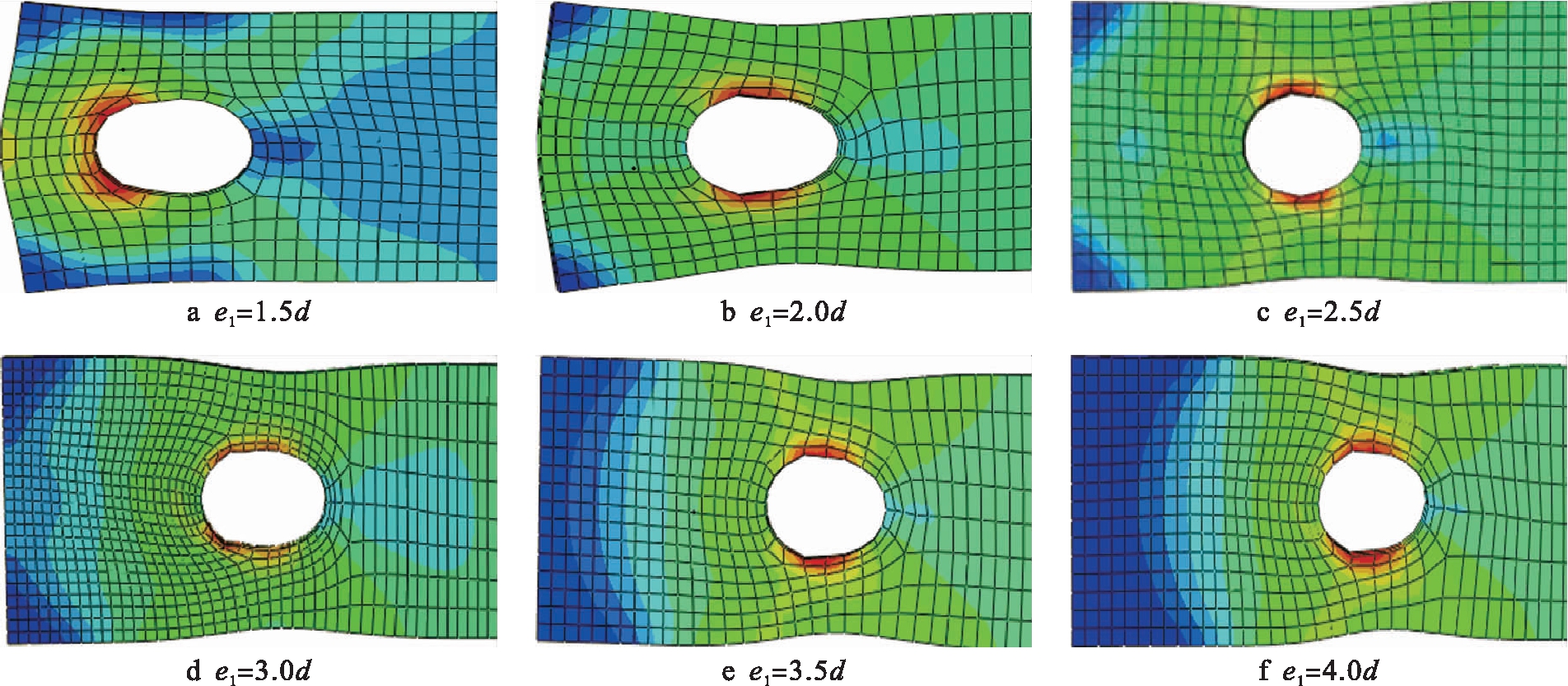 为了研究承压承载力与端距比e1/d和边距比e2/d的关系.考虑不同端距比(1.0、1.5、2.0、2.5、3.0、3.5和4.0)、边距比(1.5、2.0、2.5、3.0、3.5和4.0)设计42个试件进行有限元分析.