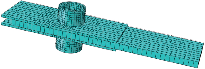 C3D8R单元有沙漏控制,计算时间少,且位移结果较精确[8],故本文采用C3D8R单元进行模拟.有限元模拟中芯板厚度为6 mm,盖板厚度为4 mm,螺栓直径为16 mm,有限元建模取螺栓盖板连接的1/2分析,且在有限元模拟中简化螺栓,将螺帽、螺母和螺杆都看作圆柱体,网格在应力集中处细化,模型如图1所示.