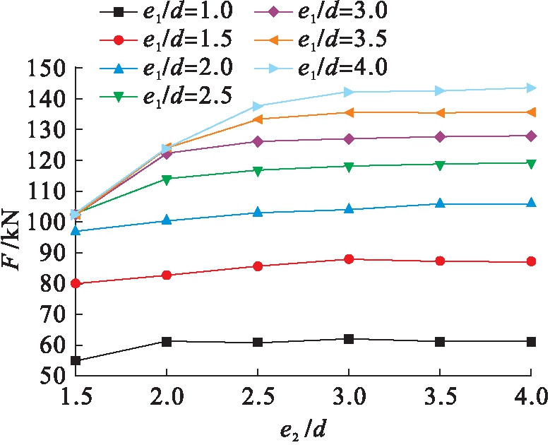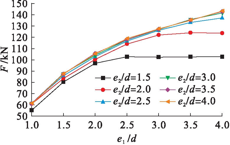 为了能直观地看到端距比对承压强度的影响,只考虑e1/d变化,将e2/d固定,假设