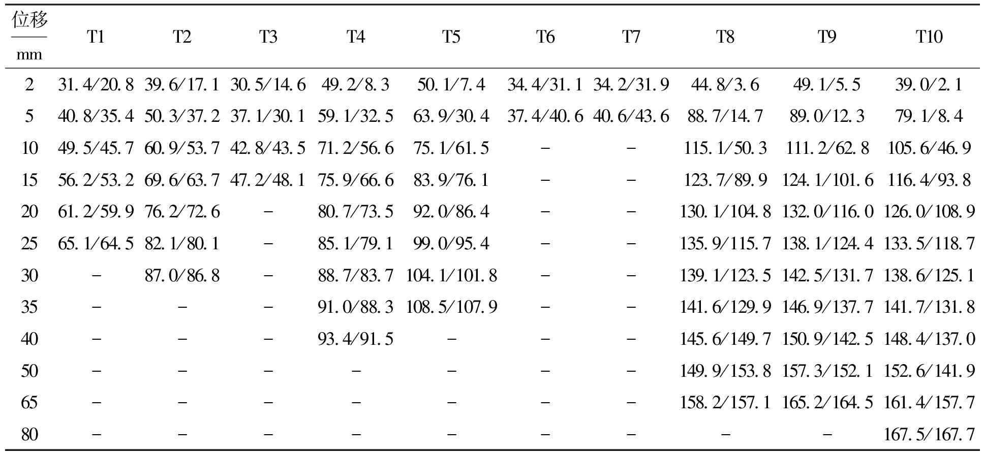 位移mmT1T2T3T4T5T6T7T8T9T10231.4/20.839.6/17.130.5/14.649.2/8.350.1/7.434.4/31.134.2/31.944.8/3.649.1/5.539.0/2.1540.8/35.450.3/37.237.1/30.159.1/32.563.9/30.437.4/40.640.6/43.688.7/14.789.0/12.379.1/8.41049.5/45.760.9/53.742.8/43.571.2/56.675.1/61.5--115.1/50.3111.2/62.8105.6/46.91556.2/53.269.6/63.747.2/48.175.9/66.683.9/76.1--123.7/89.9124.1/101.6116.4/93.82061.2/59.976.2/72.6-80.7/73.592.0/86.4--130.1/104.8132.0/116.0126.0/108.92565.1/64.582.1/80.1-85.1/79.199.0/95.4--135.9/115.7138.1/124.4133.5/118.730-87.0/86.8-88.7/83.7104.1/101.8--139.1/123.5142.5/131.7138.6/125.135---91.0/88.3108.5/107.9--141.6/129.9146.9/137.7141.7/131.840---93.4/91.5---145.6/149.7150.9/142.5148.4/137.050-------149.9/153.8157.3/152.1152.6/141.965-------158.2/157.1165.2/164.5161.4/157.780---------167.5/167.7