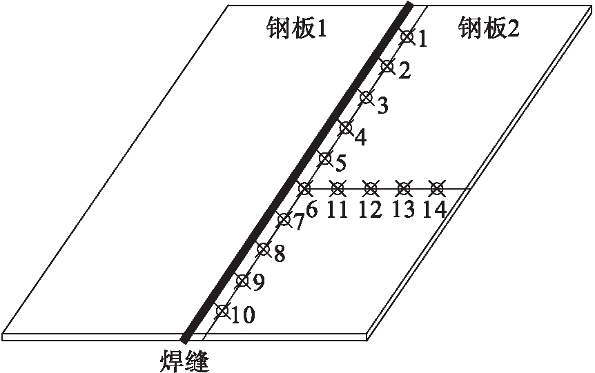 根据SL499-2010标准进行残余应力测试,钢板1和钢板2在材质和尺寸上均相同,仅需研究其一.取钢板2为研究对象,在离焊缝25 mm处引进一条与焊缝平行的边,将其平分为11等分,取其10个等分点作为测试点,并将其分别标记为序号1~10.在第6个等分点引一条垂直于焊缝的直至边缘的线段,将该线段等分为5份,取其4个等分点作为测试点,并将其分别标记为序号11~14,测试点分布如图2所示.在测试时分别取水平方向、竖直方向、45°方向作为测试方向,将所有测试点在不同方向测得的数据记录下来,结果如表2所示.