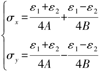 式中:σx、σy分别为焊接横向及纵向残余应力;ε1、ε2为释放应变;A、B为应变释放系数,与多种因素相关,可视为定值.由式(1)可知,该结构的焊接横向及纵向残余应力与计算建立的坐标系x轴向以及y轴向一致,将其分别定义为横向应力和纵向应力.