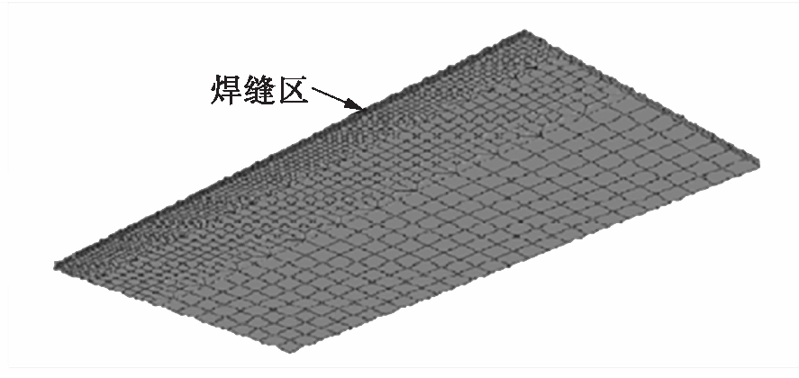 钢板1和钢板2在材质和尺寸上均相同,仅对钢板1建立有限元分析模型即可.对钢板1进行模拟计算,根据过渡网格技术对其进行模型分块处理,越靠近焊缝处网格越密集,向外逐渐呈现分散趋势,如图3所示.