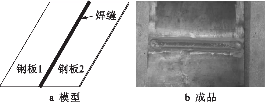 在表1焊接参数条件下对其进行焊接,焊接前需对钢板进行前处理,经由剪板机对其进行粗加工后再细加工,确保焊接面稳定.对位后先对焊缝两侧进行点焊固定位置,对接焊接模型及成品如图1所示.