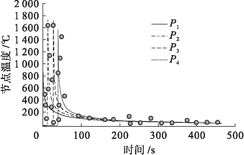 通过各测试点收集焊接过程的温度变化,将焊缝等分为3个部分,分别取两个等分点及起始和结束四个点,按照起始点到结束点的顺序依次将其标记为P1、P2、P3、P4,以时间为自变量,以各点温度为因变量绘制时间温度变化曲线.为了验证试验结果,通过计算机建模重新进行上述分析过程,并将温度场相关系数等作为基本参数输入,设定与上述模型相同的测量方式,模拟结果为离散型点状图,对其进行回归计算得出结果与试验值存在细微差别,如图4所示.