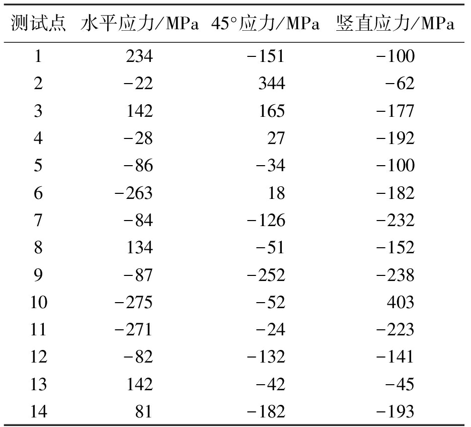 测试点水平应力/MPa45°应力/MPa竖直应力/MPa1234-151-1002-22344-623142165-1774-2827-1925-86-34-1006-26318-1827-84-126-2328134-51-1529-87-252-23810-275-5240311-271-24-22312-82-132-14113142-42-451481-182-193