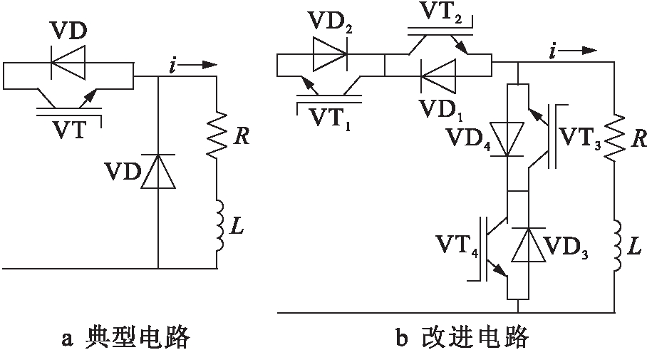 典型的Buck电路如图2a所示,包括一个负载R、阻抗L、两个普通二极管VD和一个控制通断的IGBT管VT,其中,VD用于阻止反向电压和提供续流通道.图2b为本文改进后的斩波电路,其使用两个背靠背的二极管代替原来的单二极管,并使用两个背靠背的IGBT代替原来的IGBT.改进后的斩波电路使用SPWM方式进行调制控制,并可通过采用适当的控制方法来获得期望频率的电流.如当输入端正弦电流的上半波形时,始终关断VT1和VT4,导通VT3和VD3来续流,导通VD2和VT2来斩波,此时流过负载的电流和加载在负载两端的电压均是正半周期输入;而当输入端正弦电流的下半波形时,始终关断VT2和VT3,而导通VT4和VD4来续流,导通VD1和VT1来斩波,此时流过负载的电流和加载在负载两端的电压均是负半周期输入.